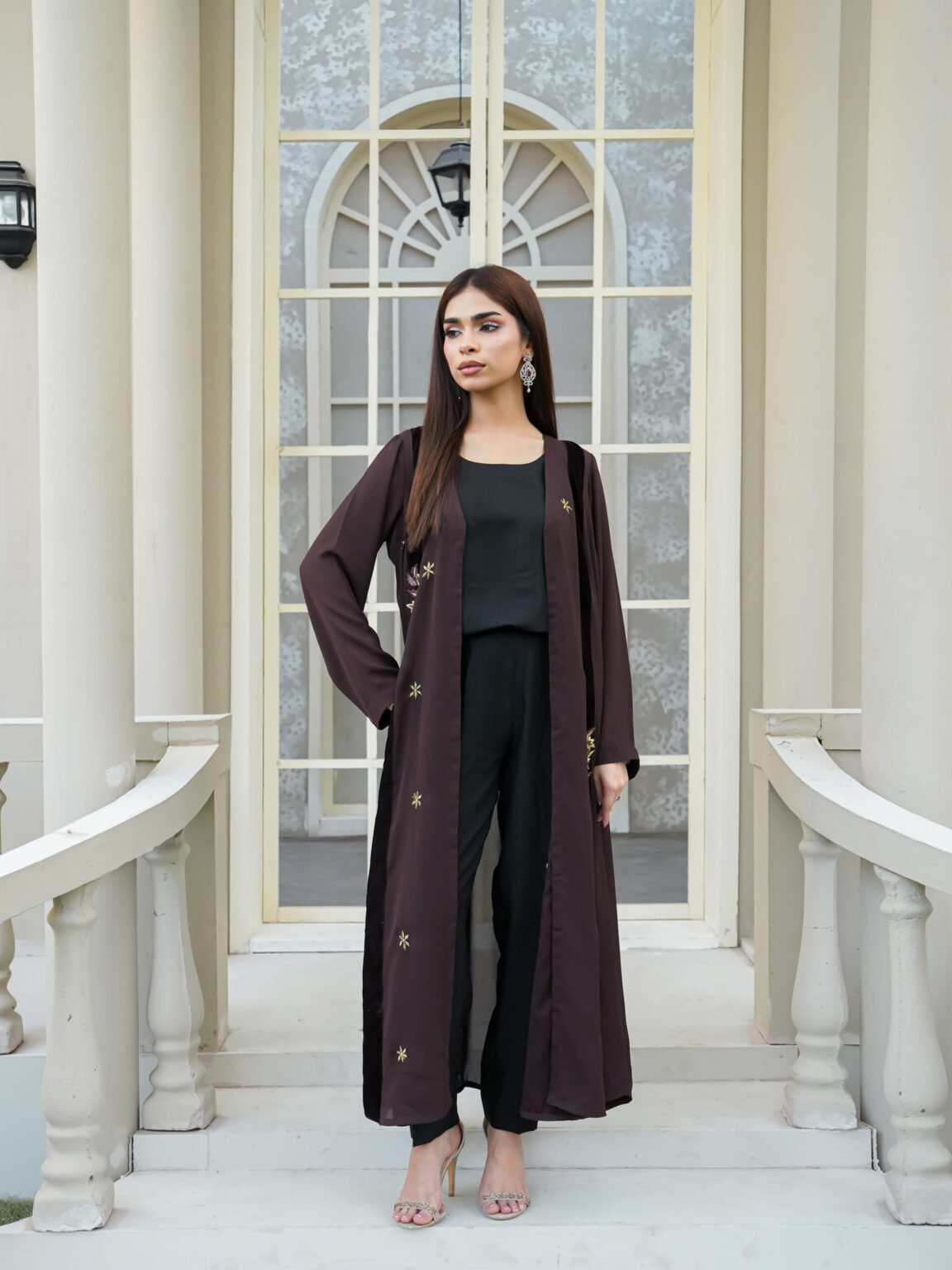 | Description | Experience the pinnacle of boutique tailoring with this exquisite Elam Wear masterpiece. This luxurious three-piece ensemble features a long-length, open-style coat in a deep espresso hue, enriched with plush velvet side panels and intricate, hand-placed floral embroidery. Paired with a sleek, minimalist black co-ord set, it offers a sophisticated silhouette designed for the modern woman who values artisanal detail and effortless poise. |